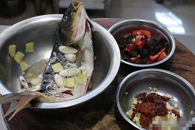 在魚身上打上一字刀,在魚尾上打上十字刀,這樣便于魚肉入味,再去掉魚牙,減少鯉魚的腥味,清洗以后放入盆中。