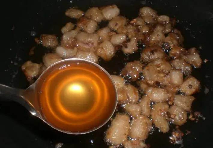 就是先加點油,再放入豬板油,有了油的潤滑,豬板油不容易糊,而且出油快。缺點是熬出來的豬油顏色發黃,因為摻雜了其它的油導致的。
