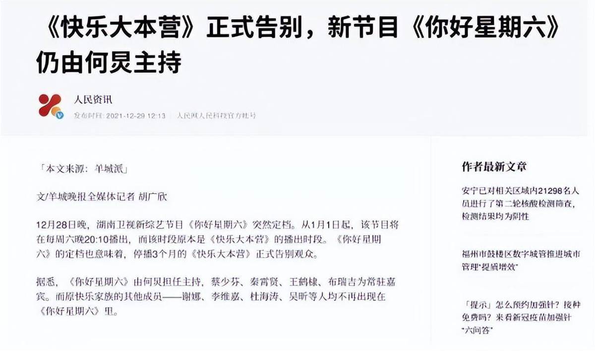 參考資料:人民資訊2021年12月29日發布關于「《快樂大本營》正式告別,新節目《你好星期六》仍由何炅主持」的報道