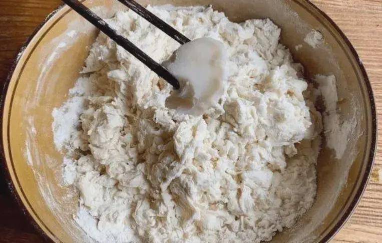 4、把酵母水或酵母牛奶倒入面粉中,用筷子攪拌成面絮,這個時候加入20克豬油,下手揉成光滑柔軟的面團。和面時加入適量豬油,可以讓饅頭膨松潔白,香甜可口。