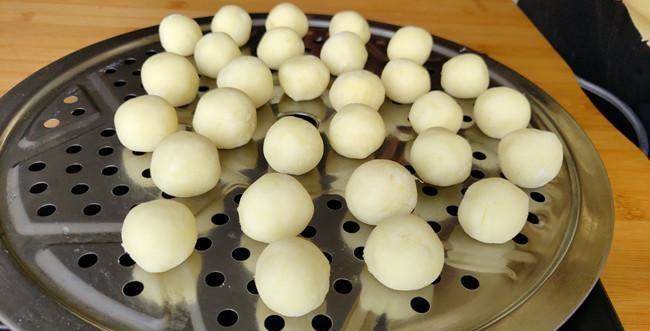 3、然后依次揉成一個個的小圓形,直接放在蓮子上,全部做好后,放在蒸鍋上,用中火蒸7、8分鐘。這個土豆球千萬不能蒸太長的時間,蒸好的狀態是,特別的Q彈。