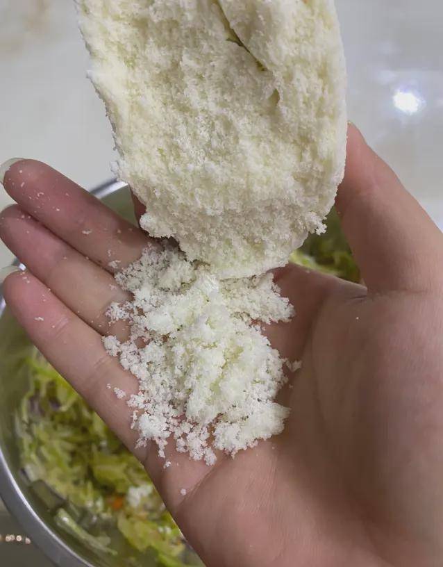 5、到了這一步,很多人都是加入面粉或淀粉了,別再這麼做了,教你一招。準備一個隔夜的饅頭,已經非常干的那種,撕掉外面的皮,把里面的饅頭搓成碎末,放入蘿卜絲中,用筷子攪拌均勻。