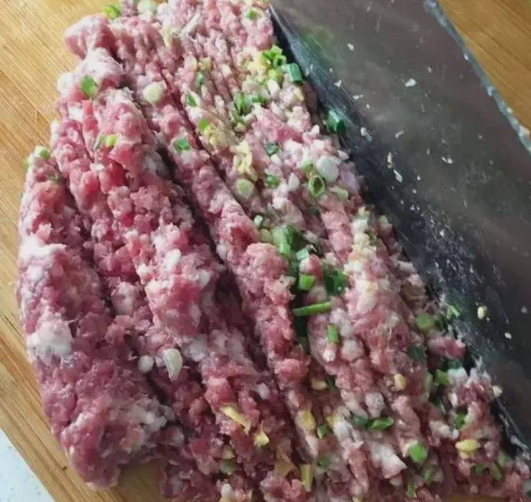 4、香蔥、生姜和肉餡一起剁,蔥姜汁會溶入肉餡中,有去腥增香的作用。肉餡不要剁得太碎,有點顆粒感最好,剁好后放入小盆里備用。