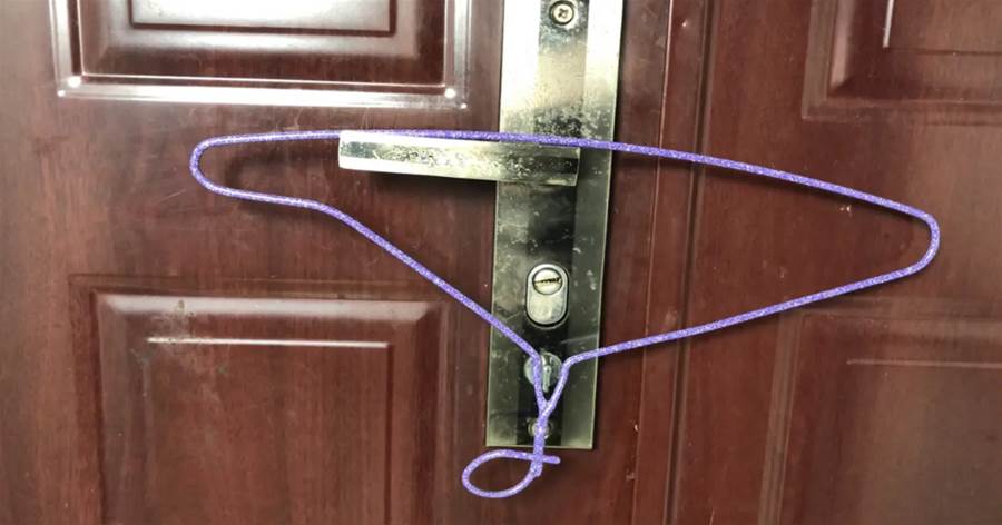 平時我們睡覺的時候都會將大門反鎖起來,很多朋友以為這樣就已經非常的安全了。但其實它也是不安全的,一些不法分子只需要利用上一些工具,也能輕松地將反鎖扣擰開來。這個時候我們就可以拿一個衣架,在衣架的掛鉤下面會有一個小凹槽,我們只需要將這個凹槽卡住門把手的反鎖按鈕,然后再將衣架的另一端掛在門把手上,衣架旁邊多余的部分,我們可以把它折起來。只需要把衣架這樣掛在門把手上,就可以大大地提高我們的安全保障。這是因為我們把反鎖的按鈕卡在衣架的凹槽里面,這樣從外面就算是有鑰匙,也不能將這個反鎖扣擰動來。